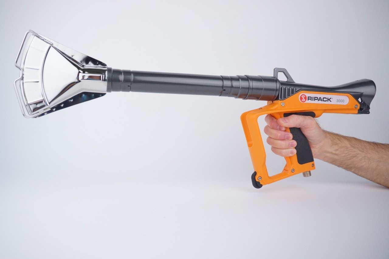 "Wenn Sie eine Schrumpfpistole im Abstand von ca. 20 cm langsam über eine LDPE-Schrumpffolie bewegen, zieht sich diese unter der Hitzeeinwirkung zusammen. Dadurch entsteht eine zweite Haut um Ihre Palette. Ware und Palette bilden eine kompakte Einheit, die nicht nur gegen Nässe, Verschmutzung und Diebstahl schützt, sondern auch eine optimale Ladungssicherung garantiert.