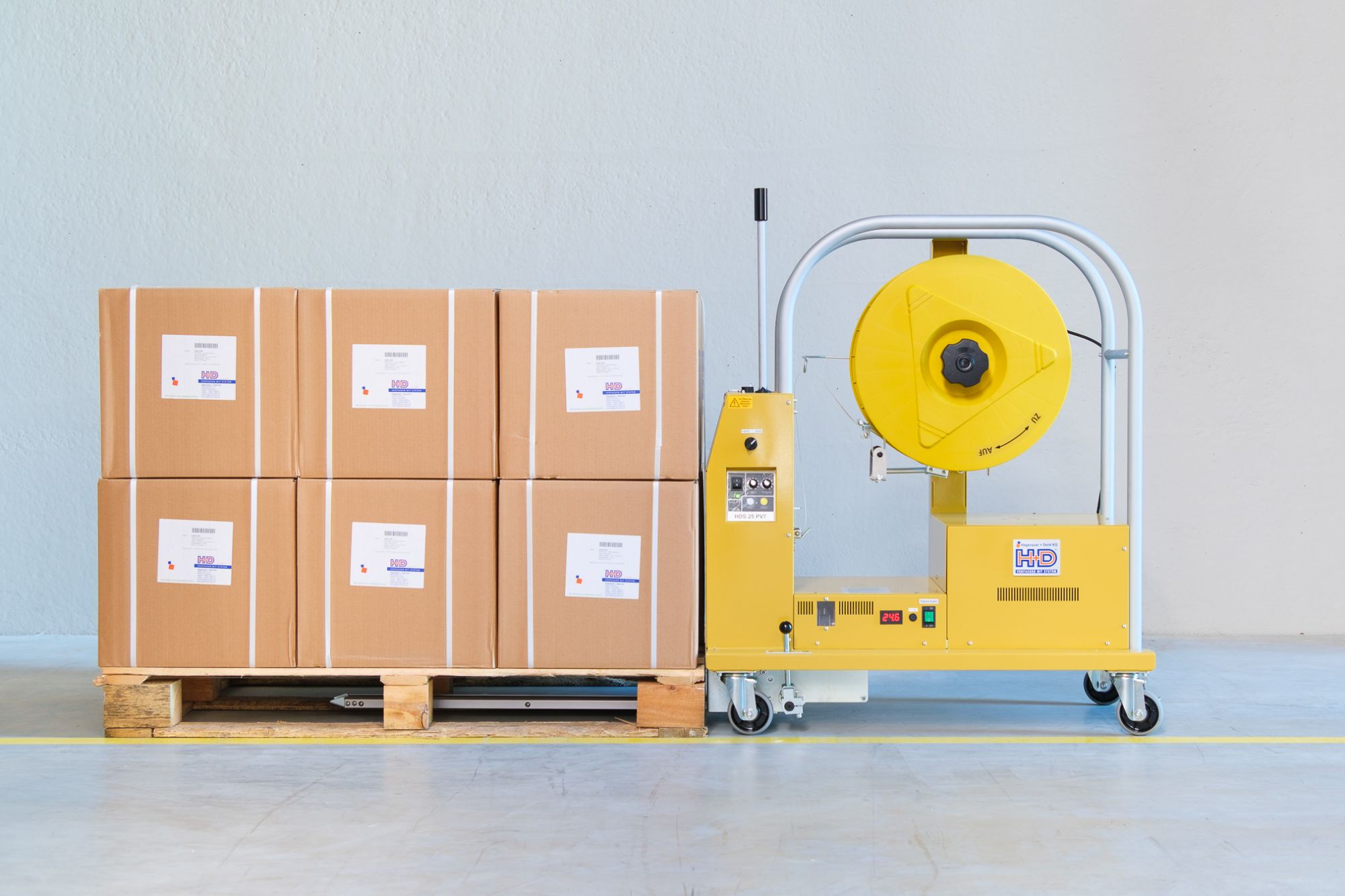 "Eine Paletten-Umreifungsmaschine erspart das umständliche Durchfädeln des Umreifungsbands unter der Palette. Weiterhin funktionieren Anspannen, Verschweißen und Abschneiden des Umreifungsbands automatisch. Die Bandspannung kann über einen Drehregler individuell eingestellt werden. Ein Oberflächenschutz besteht nur bedingt. Das Anlegen von Kantenschutzleisten ist ratsam.