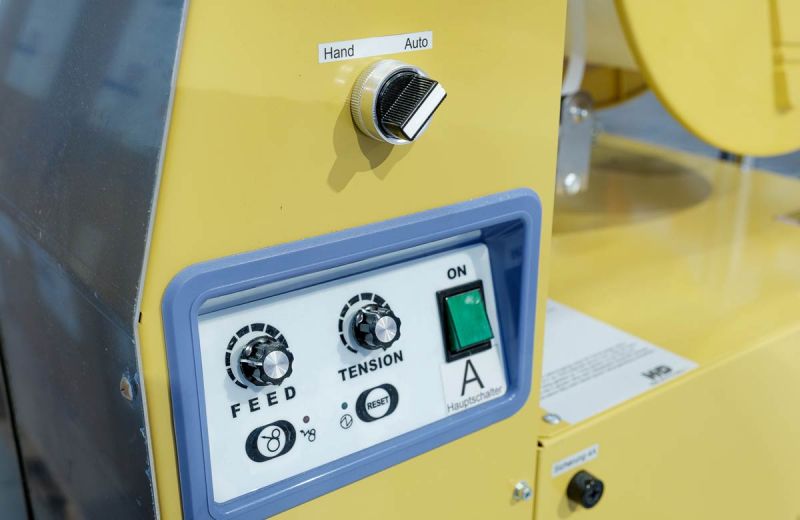 - Bedienhebel für dosierte Bandspannung bei empfindlichen Produkten oder zum Anlegen von Kantenschutz