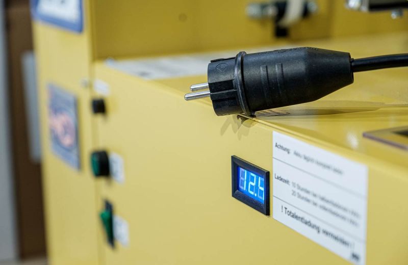 »H+D setzt für den Betrieb seiner halbautomatischen Palettenumreifungsmaschine eine hochwertige 12 V Gel-Batterie mit 85 Ah Leistung ein. Diese Batterie schafft problemlos 200 - 300 Umreifungen und kann - da dieser Typ Gel-Batterie keinen Memoryeffekt besitzt - mittels integriertem Netzkabel jederzeit, d.h. unabhängig von seinem Ladezustand, geladen werden.«