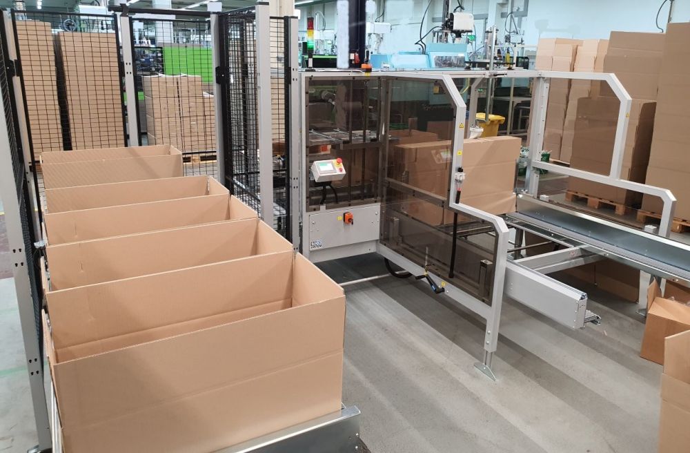 - Das zeitaufwändige Auffalten von Kartons und das Einschlagen der Bodenlaschen erfolgen automatisch.