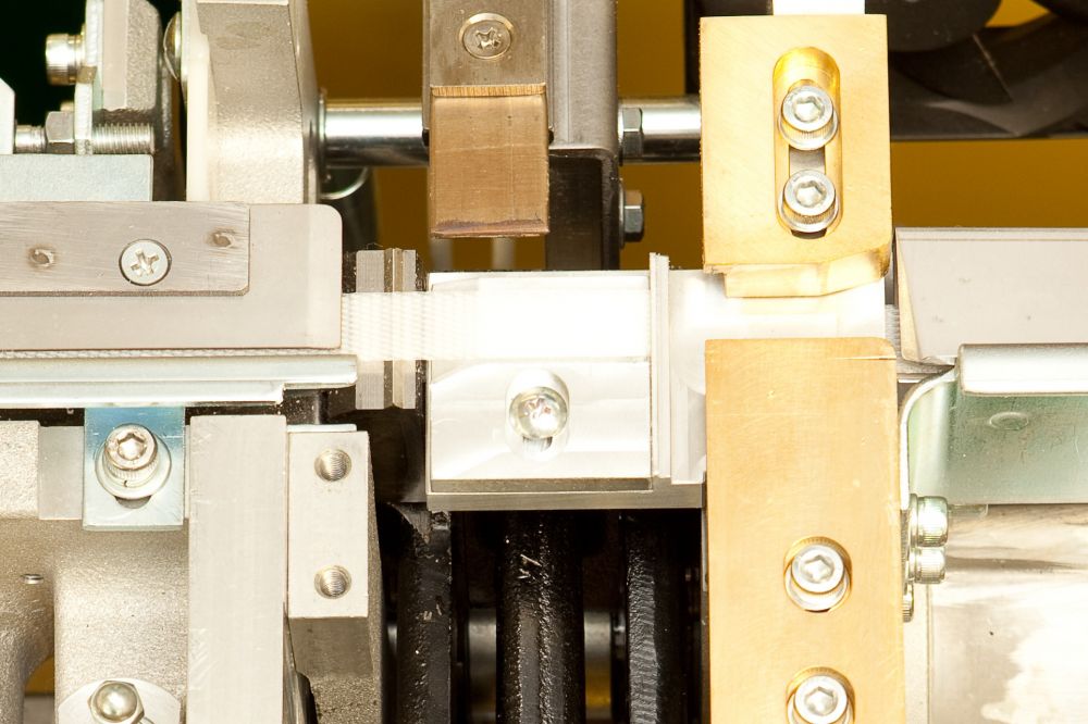 - Die Innenseiten der Kunststoff-Bänder werden durch die Schweißzunge kurzzeitig angeschmolzen.