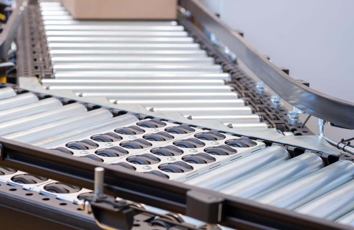 - Richtungsänderung über Rollbahnkurven mit konischen Rollen (ohne Staufunktion).